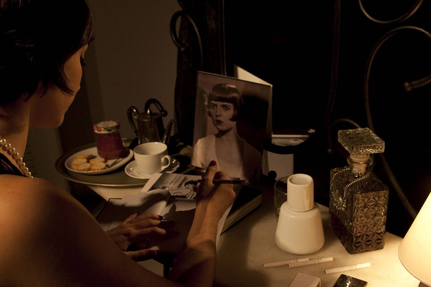 A partir desta perspectiva, resolvemos radicalizar nesta percepção fragmentada que podemos ter de uma biografia e escolhemos apenas alguns pontos por onde queríamos transitar na história da vida de Louise Brooks. Neste momento, foram incorporados à peça alguns textos da própria Louise e foram escritos outros que de alguma maneira propõem um diálogo com a escrita dela.