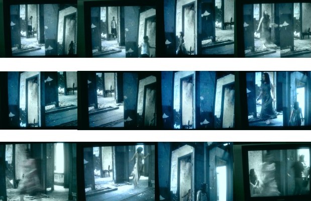A ausência presente que se figura nas paredes, no piso, nas escadas, nos portais, janelas, móveis, todos em deterioração, que expõe as suas marcas e revelam até mesmo a ausência de materiais que já desapareceram, como os rodapés que permitiram a câmera enquadrar os pés que percorriam os muitos ambientes, entra em choque, em contraste com os corpos, com a performance que se desenrola na interioridade da imagem projetada e traz vida ao espaço morto. As presenças dos performers naquele espaço e seus estados emocionais reafirmam as várias ausências. As figuras que transitam na imagem em dado momento também vão ganhando transparência e viram fantasmas que vão desaparecendo, se ausentando (Imagem 13). Assumem igualmente seus lugares de transitoriedade. Estão ali e suas presenças vivas contrastam com a matéria que se deteriora e aponta para um tempo que passou, que já não existe mais. No entanto, assim como as presenças que outrora ocuparam aquele espaço, as que estão agora, em breve, deixarão de existir. E após algumas sequências no espaço labiríntico da casa, estas presenças vão se desintegrando, assumindo seu status de fantasma, de memória que passa a flutuar pela imagem. Estas relações trazem o que estava invisível para o visível. O que estava abandonado para uma re-atualização de sua memória, onde fantasmas se corporificam habitando outros tempos, conferindo outras dimensões à casa, se incorporando a uma narrativa.