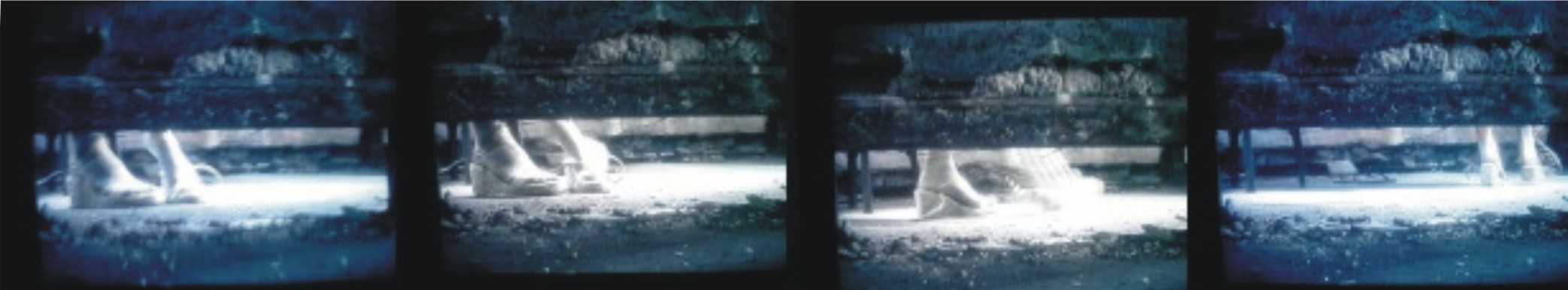 Outro caráter de especificidade do trabalho está nas imagens em vídeo que são projetadas durante a performance e dialogam diretamente com o acontecimento. A casa que serviu como locação para a gravação do vídeo fora utilizada da mesma maneira que fora encontrada, sem interferência (Imagem 11). A performance se incorpora a este espaço, é desenhada a partir dele, lidando com sua estrutura, sua natureza. Este espaço inspira e estimula a feitura das sequências sem obedecer a um roteiro feito anteriormente. Assim como a performance que acontece no momento, o vídeo será realizado de tal maneira, sendo que o espaço irá determinar as relações específicas que vão surgir. A casa utilizada, encontrada em estado de abandono tinha, por exemplo, um chão repleto de fissuras e em muitos pontos ameaçava desabar. Isso gerou um cuidado em caminhar e indicava algumas trajetórias que não poderiam ser feitas e outras que poderiam. Uma situação de espelhamento dada pelas portas e cômodos que se acumulavam permitiu um trânsito coreográfico dos performers no espaço. Em outro momento as fissuras que existiam nos rodapés das paredes permitiram que a câmera fizesse toda uma sequência de imagens por uma perspectiva que enquadrava apenas os pés que passavam anônimos (Imagem 12). A imagem criada como um site specific se revela através de ausências e presenças, transitoriedade e permanência. A começar pela própria memória inscrita na arquitetura da casa que se atualiza na performance.