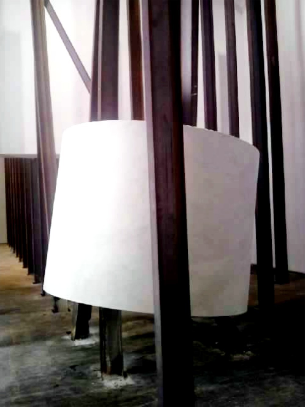 A imagem que se cria neste processo de junção das partes promove uma suspensão. O olhar se inquieta diante dos antagonismos que emergem e do acontecimento que ecoa. Ele não está mais ali, se retira, mas estranhamente permanece. A escultura surgiu de um acontecimento efêmero e único – a sua instalação – em um fazer onde o que está a priori projetado não importa mais, nem o passado nem o futuro, pois tudo será dito agora pelo momento em que ela se entrelaça ao espaço e este instante insiste em não se dissipar. O que irá afirmar a obra será dado pelo acontecimento específico, pelas tensões que atuam no espaço e pelas ações das peças umas sobre as outras, suspensas, retendo o movimento em uma temporalização da imagem. O acontecimento que agora se ausenta e permanece inquieto nas constantes formulações que a obra devolve ao espectador, se torna tão fundamental para a obra que passa também a existir enquanto registro em vídeo, remontando essa construção. Este vídeo é exibido paralelamente em outra sala no Parque Lage.