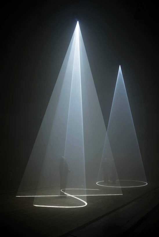 Os trabalhos de Antonhy McCall conhecidos por Solid Light Films (imagem 5) como, por exemplo, Line Describing a Cone Breath, Between You and I, e You and I, Horizontal projetam tridimensionalmente no espaço negro imagens de formas geométricas e que se corporificam por uma bruma que torna o ar denso. Os vídeos projetores são colocados na sala de maneira a fazer com que o espectador ao entrar atravesse a imagem, criando novas formas a partir do seu movimento. O corpo assume aqui uma relação escultórica com as imagens que preenchem o espaço e vão se configurar das diversas maneiras com as quais os espectadores interagirem com elas. A escultura de luz se corporifica, se torna tátil ao mesmo tempo em que paradoxalmente é pura imaterialidade para o sentido da percepção tátil (na física a luz é também um tipo de matéria). A efemeridade destas esculturas está dada pelo seu princípio enquanto projeções de luz em vídeo que se tornam visíveis pela fumaça. Sem a luz da projeção e/ou a fumaça, nada mais existe nessa escultura que trabalha com dois elementos que se dissipam, se desmaterializam, mas que ao se materializarem permitem uma imagem que forma espaços e sofre interferência do espectador.