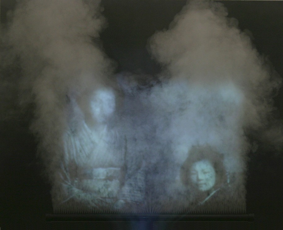Na videoinstalação Experiência de cinema (Imagem 6), Rosângela Rennó propõe uma obra que nos coloca diante da perspectiva da ausência que se presentifica na aparição da imagem no espaço. A artista projeta constantemente fotografias antigas de pessoas sobre a fumaça que é lançada verticalmente em intervalos regulares na área da projeção, fazendo com que a imagem que ali está se torne visível. Após oito segundos esta fumaça se dissipa, desmanchando também as pessoas que ali fantasmagoricamente se presentificavam. Esta imagem memória que se materializa faz ressurgir tridimensionalmente um ser que já não existe mais, trazendo de volta um corpo imaterial. Nesse ir e vir da imagem que se forma e se des-forma a experiência do acontecimento se dá no fazer e refazer que dura apenas oito segundos e em seguida deixa de existir de novo para voltar a existir em seguida. Esse jogo da presença ausente da imagem fotográfica que traz de volta um ser, se reafirma no próprio circuito da obra que cria uma presença que se ausenta, mas que se presentifica de novo em tempos regulares. Esta proposição “lembra tanto as impressões fugidias das lanternas mágicas quanto os primeiros usos da fotografia”(4). E estas imagens, que assim como surgem desaparecem, nos devolvem o olhar em sua desaparição. Na sua impermanência a obra se ausenta. Na imagem flutuante vemos os olhos que nos olham e, depois que elas se dissipam, ficamos apenas diante dos nossos olhos que nos olham. A própria experiência na interioridade da obra também implica nesse rebatimento de olhares onde estar diante da obra é estar diante de si.