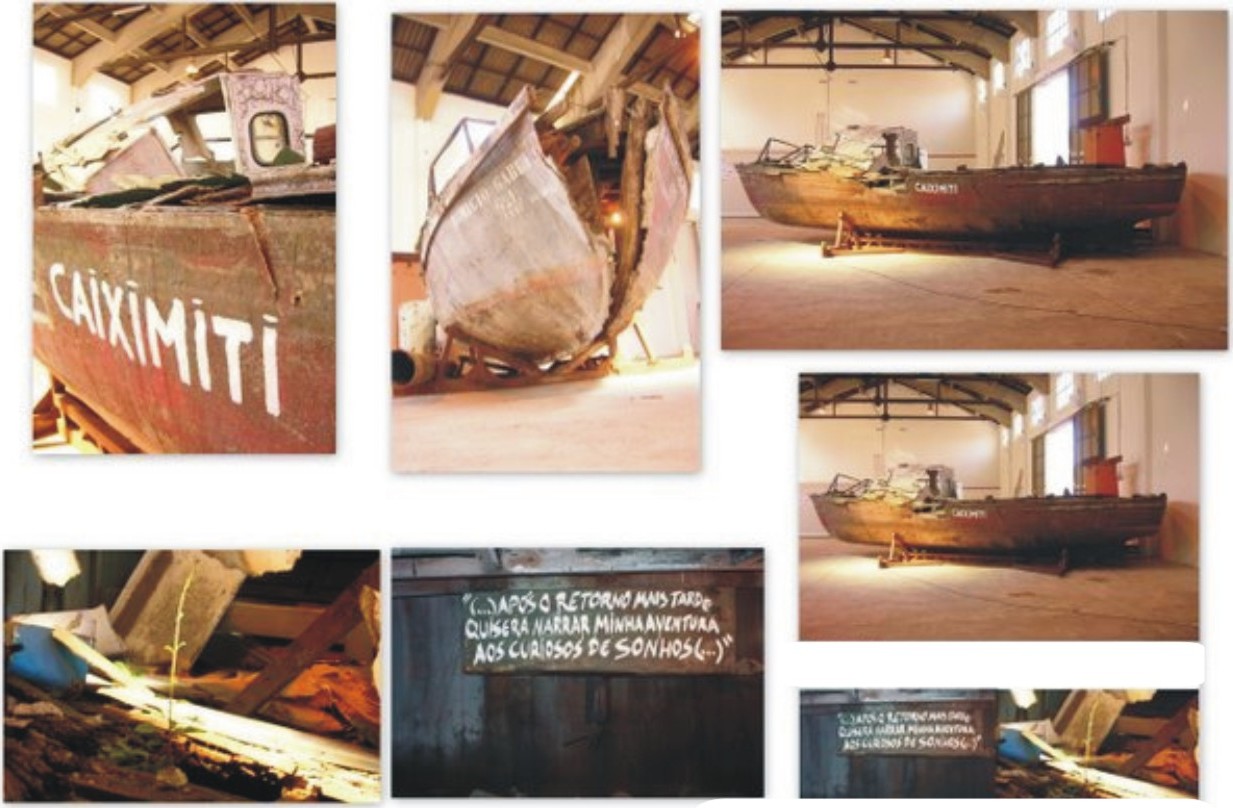 Na obra Engrenagem – 2º afeto (Imagem 8), Bonder ocupou o vão central da escada do Castelinho do Flamengo entrelaçando televisores, refrigeradores, cadeiras, armários, lâmpadas, fios, monitores e diversos objetos que foram encontrados pela própria artista em salas e depósitos do espaço. Todos estavam em desuso, danificados, mas como eram patrimoniados não podiam ser descartados, acumulando-se como lixo na instituição. Dessa forma, a obra ao se formar já é fadada a sua finitude, não só pelas relações tão específicas que a montagem faz com que ela ganhe no espaço, como nas obras de Nelson Félix e de Antonhy McCall, mas porque na impossibilidade de retirada dos objetos, ela é obrigada a se dissolver e esconder no próprio espaço onde foi criada. Essa transitoriedade plena do trabalho afirma as presenças que se ausentam. Os objetos que ganharam sua invisibilidade enquanto matéria em desuso, mas que não é descartada, quer dizer, permanece presente estando ausente no espaço utilitário, assumem agora outra visibilidade, re-significados na instalação escultórica que torna presente a ausência de um tempo que a memória impressa nos elementos nos remete. No entanto, estes objetos brevemente se ausentarão novamente, retornando ao status de invisibilidade presente após seu desmonte. A memória que guarda estes objetos é, sobretudo, o artifício que mais impregna essa imagem quando experimentamos este espaço que precisa ser percorrido, adentrado para que se configure a relação. No Castelinho, o espectador tinha que percorrer toda a escada em espiral onde a obra acontecia no vão central, o que fazia com que ele tivesse que circundar a obra de maneira ascensional, para então fruir por diferentes perspectivas e perceber pequenos detalhes vistos apenas de determinados ângulos. Em Caiximiti (Imagem 9), criada para o 7º Salão do Mar, realizada no Porto de Vitória, a artista içou do mar um barco em deterioração que estava semi-afundado e guardava memórias inscritas em sua superfície. Colocou no seu interior uma lâmpada que iluminava uma vegetação que crescia e em cima podia ser lido “… após o retorno mais tarde quisera narrar minha aventura”. O interior da embarcação era visto através das fissuras no casco.