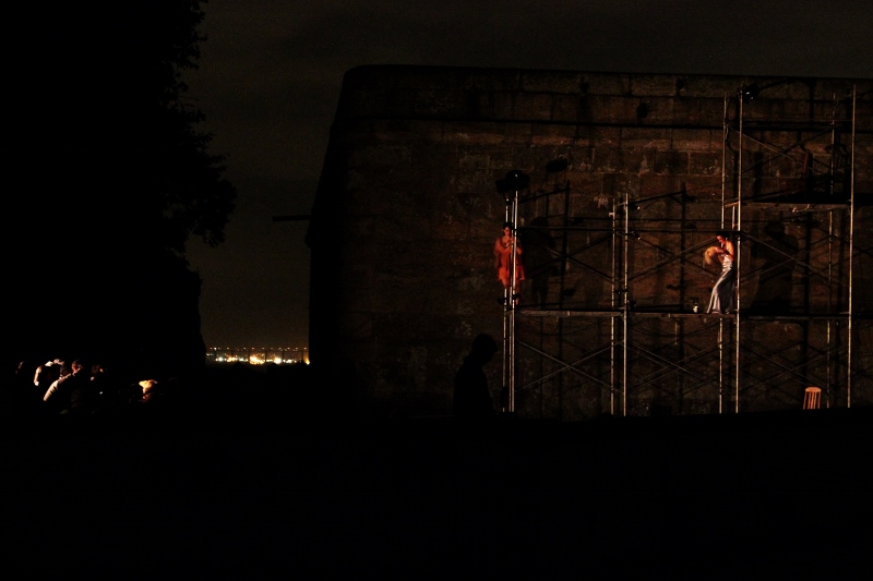Com direção de Bruno Henriquez e orientação de Rosyane Trotta, Sobre Troia[s] esteve em cartaz no Forte de São João [Forte da Urca], numa parceria inédita entre a Universidade Federal do Estado do Rio de Janeiro e o Ministério do Exército. Com efeito, não há lugar mais apropriado para encenar a guerra do que a própria construção da guerra, cujas paredes, canhões e casas-mata testemunham e murmuram incessantemente isso. Lugar de memória, simbólico e funcional; lugar de história, repleto de vestígios petrificados, inscritos em arquivos: a construção, as armas e munições, os corpos dos atores itinerantes – “o memento, o índice, a prova e o testemunho.” (1)