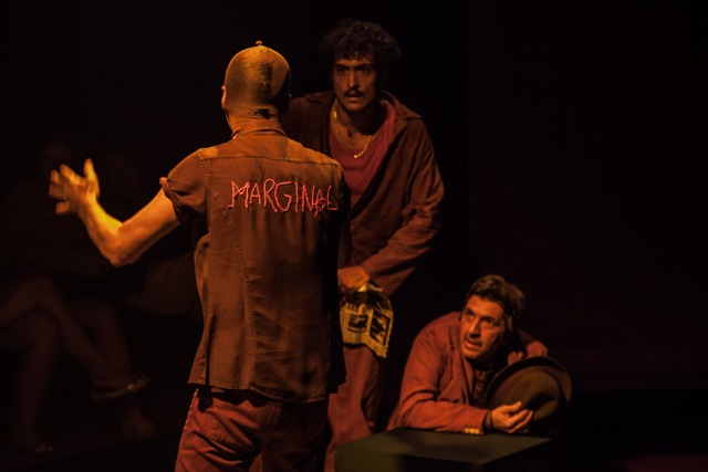 Não é vão o fato de o espetáculo surgir com a imagem projetada numa tela que logo se duplica em duas, na qual um ELE (Ricardo Kosovski) especula sobre o próprio sentido da arte e da violência – texto dito pelo ator debochadamente, retirando qualquer élan professoral da fala. Também não é sem intenção que após a projeção apareça uma banda tocando no palco (elevado) entre as duas telas, e a cena ficcional de Cara de Cavalo (Remo Trajano) com Mangueirinha (Carolina Chalita) se dê em seguida, ao centro, e abaixo desses acontecimentos, formando curvas e dobras “barrocas”, na qual a multiplicidade da reflexão/ficção/imagens/real, dobram-se, a todo tempo, no próprio espaço físico (múltiplos palcos) a fim de transformar o teatro em um dispositivo aglutinador e antropofágico, sem perder de vista o quão violenta é a espetacularização do mundo.