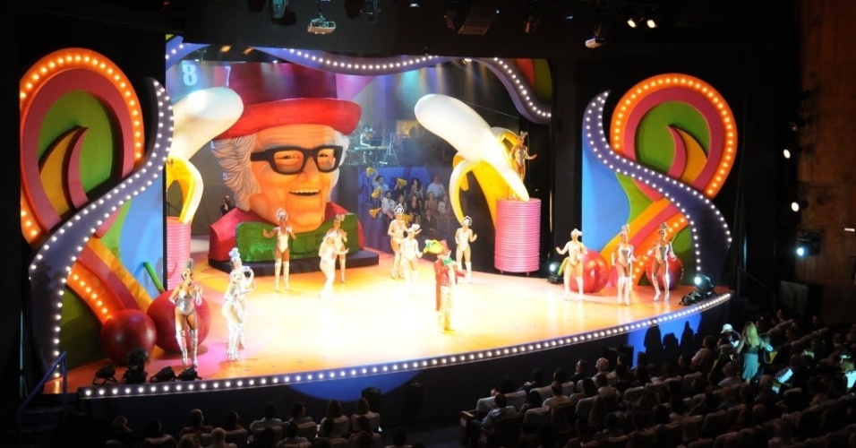 Previsivelmente, o segundo ato começa. Grandioso, no que diz respeito aos cenários dos programas que Chacrinha apresentou; detalhista, quanto aos figurinos do personagem principal e das figuras famosas dos programas. As chacretes, por exemplo, além dos figurinos-réplicas, apresentam-se para o público, descendo até os corredores da plateia, com uma intimidade de pessoas que se conhecessem há anos, fazendo poses para as fotos. O segundo ato pode ser fotografado, é um show de auditório, os celulares não saem das mãos das pessoas sedentas por capturar uma imagem-memória. É uma biografia revival. Episódios conhecidos de quadros famosos dos programas se alternam no ritmo dos pout-pourri das músicas-do-ano. “Era assim mesmo”. Sucesso. A narrativa biográfica se constrói numa justaposição de episódios e músicas que deixa a estrutura dramatúrgica um tanto a mercê do excesso de momentos. Quando a fase da “decadência” surge, começa feito um corte, “de repente” lembra-se que Chacrinha foi muito criticado, chamado de louco, burro, etc., que seu programa era decadente. Chacrinha vai para o analista entender quem é Chacrinha, quem é Abelardo. Essa entrada brusca (e literal) da psicologia na história, para uma dramaturgia que não se apropriou da narrativa até então, contribui para a impressão de um movimento (dramatúrgico) forjado de declínio.
