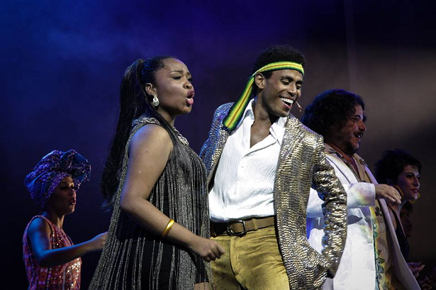 Ícaro Silva constrói um Simonal com malemolência, “pilantragem”, com movimentos de corpo que até lembram o artista, mas o foco não está em um tipo mais rasteiro de imitação. Por exemplo, ele não tem os traços de Simonal, o que é comum nas montagens biográficas e, às vezes, até um pré-requisito para o ator poder protagonizá-las. É bom lembrar também que, em espetáculos assim, não são os biografados os únicos personagens famosos. Em S’imbora…, além de Simonal, temos Carlos Imperial, Eduardo Araújo, Miele, Roberto Bôscoli, e tantas outras figuras que faziam parte do ciclo social desses artistas. Os produtores estão presentes em muitos espetáculos: Boni, por exemplo, está tanto em Chacrinha quanto em S’imbora, e de forma muito marcante. Por isso, seria interessante pensar por que, apesar de conhecidos, a interpretação dos protagonistas apresenta um rigor superior à dos demais personagens. E quando se assume um tom satírico (como acontece mais enfaticamente em Chacrinha) com os personagens famosos que aparecem pontualmente, como Roberto Carlos, Elis Regina, Elke Maravilha, Ritchie, Caetano Veloso, Dercy, etc., a sátira se transforma quase que em um deboche, de um jeito que dá a impressão de o personagem surgir para cumprir uma cota de figuras das épocas.