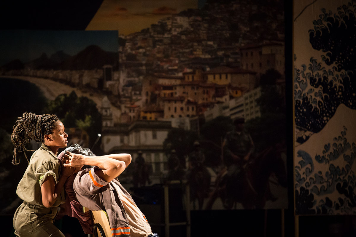 As atuações são permeadas por uma unidade contraditória de afeto: ternura e agressão estão presentes nos gestos que aproximam e ao mesmo tempo distanciam os atores. O abraço aperta demais, a brincadeira vira luta, o afago um empurrão. O circuito invade a experiência teatral, não chegando à agressão do espectador, construindo uma relação próxima do público. A cena que melhor representa essa atitude se dá pelos relatos pessoais (e não importa muito se ficcionais ou não) sobre a vivência dos atores no Rio de Janeiro. São relatos de perda e dor, com um pequeno espaço para a esperança. A possibilidade de sair da Maré, ou nela poder se enraizar, projeta para o futuro a vida dos atores. Nesse momento sentimos o assunto da peça, que está muito além do que o texto pôde oferecer. É nela que compreendemos a função empática que se faz pela capacidade de se pôr no lugar do outro, traço que nos define e nos diferencia. Não há como negar que o público se comove e se vê, também, naquele afeto. Há outra cena que utilizando do recurso identificatório segue outro sentimento: ao falar sobre o irmão traficante, Iltinho, filho adotivo de Santo, como Rose, hoje chefe do tráfico, Rose diz: “Iltinho gosta, Iltinho mata rindo”. Momento antes o ator tinha feito diretamente ao público a pergunta: “Não existe gente ruim?” A plateia confirma. Começa um som de funk. A coreografia da cena é feita com tal agressividade que desconstrói qualquer imaginário positivado, mesmo aquele que circula e integra sobre o símbolo “diva” características identitárias que outrora buscaram se configurar como resistência social. Não há glamour, beleza, vida em qualquer movimento. A coreografia somada ao texto (que narra a crueldade com que Ilto pratica seus crimes) reforça o abuso, a ofensa, a desmedida de qualquer ato contra a vida. O público se cala e engole amargo a resposta de que tem gente que nasce ruim. O discurso ideológico de uma “ruindade de nascença” é desconstruído pelos corpos em gestos repetidos, mecanizados, brutalizados, e nos vemos também assim. Sem humanidade. Como, entretanto, na peça as cenas mencionadas não seguem essa exposição, ao localizar quase em seu final os relatos pessoais, fica a sugestão de que o mundo pode ser “recomposto”, ainda que precariamente.