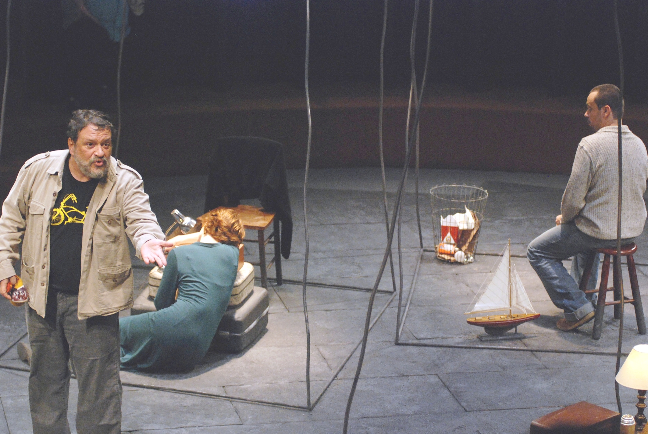 Na arena do Espaço SESC, a peça O que eu gostaria de dizer, dirigida por Marcio Abreu, apresenta três unidades de espaço, delineadas por esculturas cenográficas de Cláudio Alvarez. Cada um desses espaços é ocupado por um dos atores. A partir desses pequenos universos, três personagens se expressam e, direta ou indiretamente, se relacionam. Dos três espaços, um fica mais afastado: é a sala do personagem de Luis Melo, com poltrona, almofada, mesa de cabeceira, rádio, apoio para os pés. Os outros dois estão mais próximos entre si, embora separados: formam a casa de um casal em vias de separação. O espaço de Bianca Ramoneda é ocupado por uma cadeira, duas malas e um abajur, enquanto o de Márcio Vito contém apenas uma miniatura de veleiro, um banquinho, uma lata de lixo e uma lâmpada. As esculturas são formadas apenas pelo que seria a ossatura de um espaço fechado – os contornos estão traçados, mas não há paredes. Assim, o cenário cria certo isolamento para cada personagem, mas os mantém dentro do mesmo campo visual.