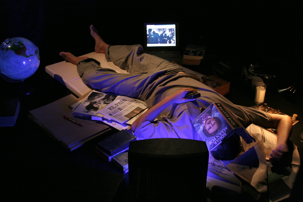 O espetáculo Todo o tempo do mundo, realizado pelo Studio Stanislavski, instala a cena e a platéia dentro do palco do Teatro Maria Clara Machado, formando um outro espaço circular. A cenografia de José Dias intervém efetivamente no ambiente, criando um novo lugar. O espaço de atuação se descola da arquitetura daquele teatro. No centro, um tablado redondo que gira sobre o seu próprio eixo é o suporte para a linha diretriz da trama: o tempo em que um homem ficou preso, os sonhos que teve, sua relação com estes sonhos e a conclusão que se pode tirar desta história. Em torno do pequeno círculo/cela, outro se forma pela disposição intercalada de cadeiras para o público e espaços para as cenas. A divisão entre estes espaços é feita por um véu escuro e pela iluminação. As cenas que acontecem nestes espaços, que às vezes se assemelham a pequenos nichos, apresentam os sonhos do homem que está deitado em seu catre – percebemos esta relação logo de início pois as cenas no círculo exterior só acontecem enquanto o personagem que está no centro dorme.